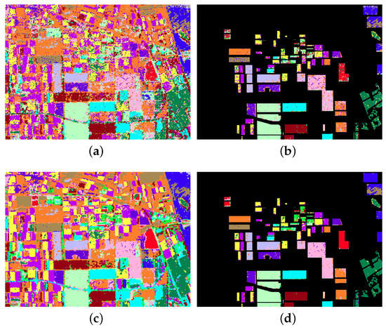 The visual classification results by CNN and QCNN on Oberpfaffenhofen data set. (a) The classification result obtained by CNN. (b) The result map (a) overlaids with the ground truth map. (c) The classification result obtained by QCNN. (d) The result map (c) overlaids with the ground truth map.