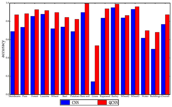 The classification accuracies by CNN and QCNN on Oberpfaffenhofen data set.