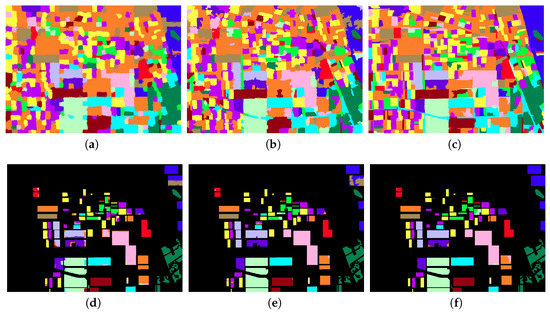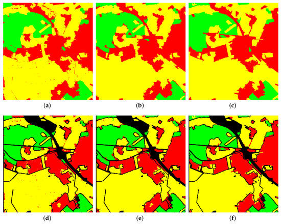 he visual classification results on Oberpfaffenhofen data set. (a) The classification map by QSLIC. (b) The classification map by QSEEDs. (c) The classification map by QPAN. (d) The classification map (a) overlaid with the ground truth map. (e) The classification map (b) overlaid with the ground truth map. (f) The classification map (c) overlaid with the ground truth map.
