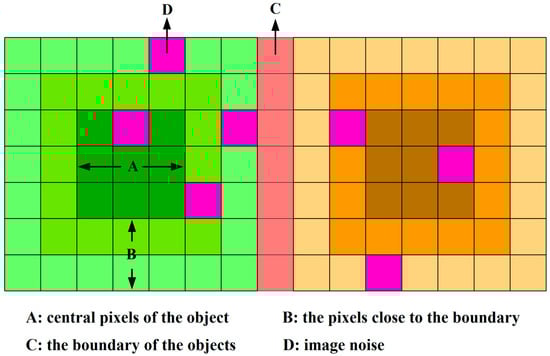 From the perspective of the geospatial domain, RS images are composed of many different ground objects, such as trees, houses, and water bodies. For the objects in an RS image, the spatial distribution of their internal pixels is usually as illustrated in Figure 1 []. Specifically, mixed pixels with different mixing levels (e.g., pixels in part C in Figure 1) tend to appear at the boundary of various objects in the image. Moreover, since the pixels that are close to the boundary of the object (e.g., the pixels in Figure 1B) are usually affected by the spectral reflection of the other types of adjacent objects, whose features typically have different degrees of change, thus resulting in a certain difference between the features of these pixels and the features of the object to which these pixels belong. The closer the pixels are to the boundary, the more they are affected and the greater this difference is. Therefore, these mixed pixels and the pixels close to the boundary of the object tend to have significant differences from the surrounding neighborhood pixels. Moreover, they tend to have high classification uncertainty and are easily misclassified in an image classification task because they are mixed with the features of other categories in different proportions. However, the object’s central pixels (e.g., pixels in part A in Figure 1), which are far from object’s boundary, are hardly affected by the spectral reflection of other adjacent objects. Thus, their features tend to be relatively pure and consistent. In other words, they are less different from the surrounding neighborhood pixels. During image classification, these pixels tend to have low uncertainty and are easily classified correctly. For random noises in the image (e.g., the pixels in Figure 1D), their features are random and frequently have significant differences with the surrounding neighborhood pixels. Thus, they have very high uncertainty and are very easily misclassified in image classification. From the abovementioned analysis, we can conclude that the pixels with high uncertainty, such as noises, mixed pixels at the boundary of the object, and pixels close to the boundary of the object, have a common characteristic in that their features are generally different from those of their surrounding neighborhood pixels in the geospatial domain. Conversely, for pixels with low uncertainty, such as central pixels far from the boundary of the object, the difference between their features and the features of their surrounding neighborhood pixels is very small in the geospatial domain. On this basis, we can quantitatively measure and model the uncertainty of the features of different pixels in the geospatial domain.