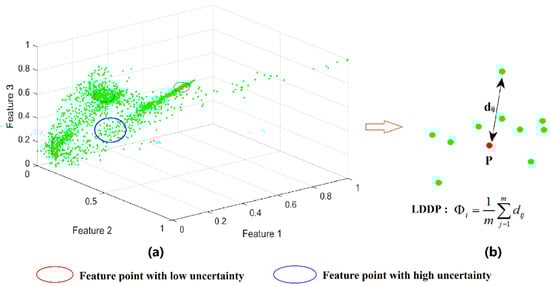 Here, we propose the Local Distribution Density of Points (LDDP) to measure the intensity of the distribution of feature points in the feature space and use it to represent the feature uncertainty of pixels in the feature space domain. In this study, as shown in Figure 3b, the LDDP () of the i-th feature point P in the feature space (corresponding to the i-th pixel P in the image) is defined as the average of the distances between the m feature points closest to P and point P in the feature space. LDDP is calculated using Equation (8):