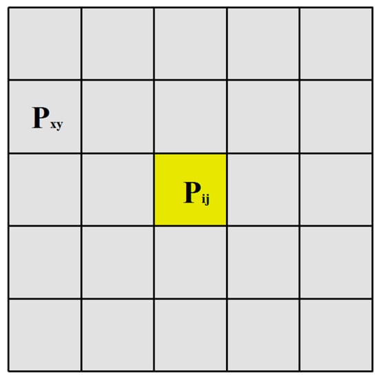 We first calculate the feature uncertainty of the image in each dimension feature. Let be a pixel in image X. In the n-th-dimensional feature of the image, the K*K neighborhood centered on is represented by (including the central pixel ) and , where N is the total dimension of the extracted features from image X. Figure 4 depicts an example of the K*K neighborhood of pixel (K = 5). Pixel is the pixel of the x-th row and the y-th column in the K*K neighborhood . In addition, the n-th-dimensional features of pixel and pixel are represented by and , respectively.