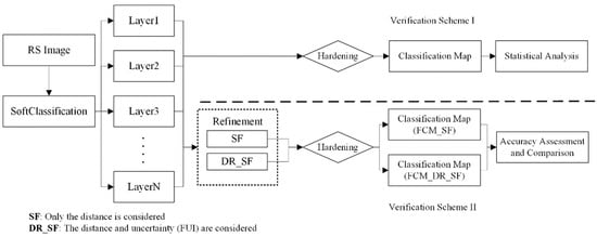 Flowcharts of two verification schemes (LayerN represents the probability map that the image is classified into the N-th class in the soft classification results, and “Hardening” represents the hardening process of soft classification results based on the principle of maximum membership). DR_SF, Distance and Reliability-based Spatial Filtering; SF, Spatial Filtering; FCM, Final Classification Map.