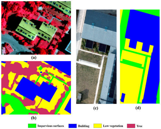 Experimental data: (a) false color original Vaihingen image; (b) ground truth reference for Vaihingen image; (c) true color original Potsdam image; and (d) ground truth reference for Potsdam image.