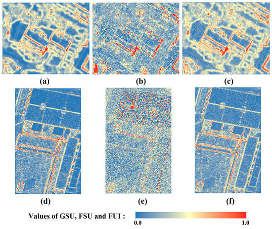 The GSUs and FSUs of the Vaihingen and Potsdam images are first calculated on the basis of the methods described in Section 3. Then, the GSUs and FSUs are integrated to obtain the final FUIs. The GSUs, FSUs, and FUIs of the two images are depicted in Figure 7.
