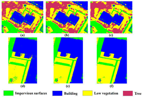 Original classification maps (OCMs), FCM_SFs, and FCM_ DR_SFs of Vaihingen and Potsdam images: (a) OCM of Vaihingen; (b) FCM_SF of Vaihingen; (c) FCM_ DR_SF of Vaihingen; (d) OCM of Potsdam; (e) FCM_SF of Potsdam; and (f) FCM_ DR_SF of Potsdam.
