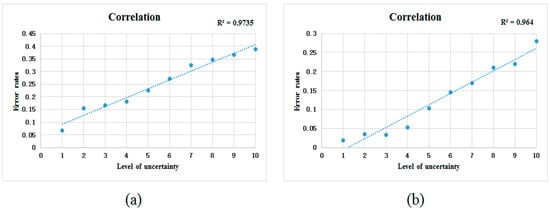According to the statistical meaning of Pearson correlation coefficient [], the larger the absolute value of coefficient R between feature uncertainty levels and classification error rates is, the stronger the correlation between them. Furthermore, they are positively correlated when the coefficient R’s value is positive, and vice versa. Evidently, the stronger the correlation is, the more effective the proposed feature uncertainty modeling approach.