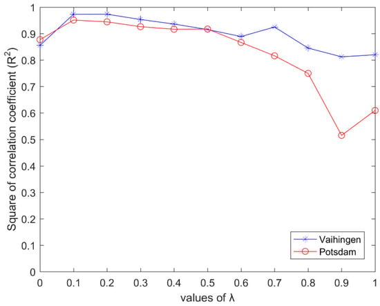 (1) To adjust coefficient , we fix the values of K and m (K = 5, m = 15 for Vaihingen; and K = 5, m = 15 for Potsdam) and let the value of vary from 0 to 1 at intervals of 0.1. The relationship between parameter and the square of correlation coefficient R (R2) for each dataset is depicted in Figure 10.