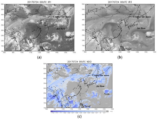 Images at 00:00 on 24 July 2017 showing Typhoon Noru, a cooler air mass and jet flow to the north, and Typhoon Nesat to the south. (a) IR1 image, (b) IR3 (water vapor (WV)) image, and (c) normalized difference convection index (NDCI) image.