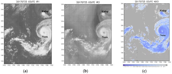 Images of tropical storm (TS) Kulap starting to merge with Typhoon Noru at 02:30 on 25 July 2017: (a) IR1 image, (b) IR3 (WV) image and (c) NDCI image.