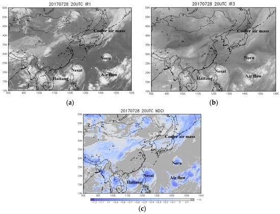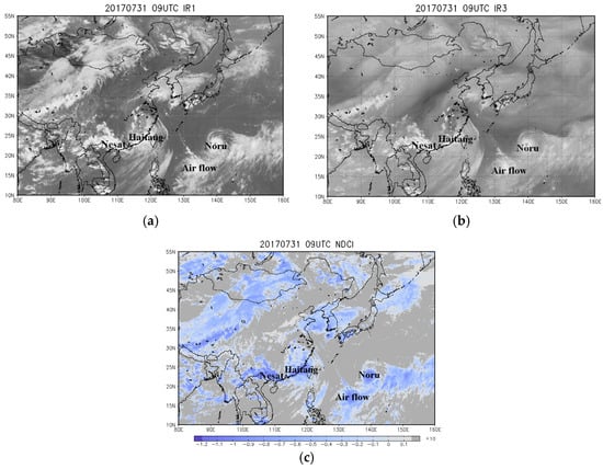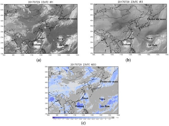 Images at 22:50 on 29 July 2017 of Typhoon Noru, Typhoon Nesat, TS Haitang, a cooler air mass to the north, and dominant air flow to the south east. (a) IR1 image, (b) IR3 (WV) image and (c) NDCI image.