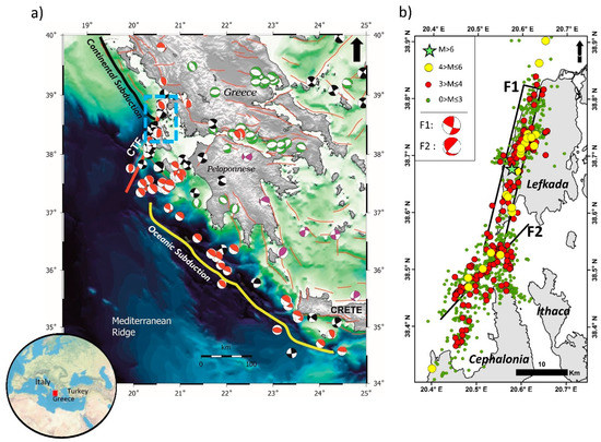 The Cephalonia–Lefkada Transform Fault Zone (CTF) in western Greece (Figure 1a), connects two different subducting regimes: subduction of continental lithosphere to the north, with subduction of oceanic lithosphere to the south [1]. The CTF is known for its frequent seismic activity with a well-known historical record [2] and is related to dextral-strike slip motions, which sometimes are connected with thrust components [3,4,5,6]. The CTF consists of two active segments: the Cephalonia segment and the Lefkada segment, which run parallel and very close to the western coastline of these islands [4]. The exact mapping of the fault trace is still not known, and its position is inferred, mainly, from the bathymetry.