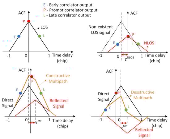 For the MP, however, the estimated propagation time delay is dependent on multiple parameters such as the relative phase, , between the direct and the reflected signal, the coefficient of reflection, , and the additional code delay of the reflected signal, . The mathematical expression can be found in [35] for both coherent and noncoherent code discriminators. Figure 1 also shows cases of constructive () MP and destructive () MP. Compared with the LOS/NLOS signal, the ACF shape of the MP signal is distorted due to the superposition of the direct and reflected signal. The prompt correlator output is no longer at the correlation peak, which provides an opportunity for detecting MP. Two conclusions can be drawn based on the above analysis: (1) The ACF shape of MP is asymmetric, with the correlation peak on either left or right side of the prompt correlator. For the NLOS, however, the ACF is still symmetric, with the correlation peak exactly in the prompt correlator. The only difference between the LOS and NLOS ACFs is the magnitude of correlation peak, considering the reflection attenuation. (2) The estimated propagation time delay of NLOS is always bigger than that of the direct LOS signal, whereas it can be either greater or smaller for the MP signal depending on the relative phase between the direct and the reflected signal. As a result, the pseudorange measurement error for the NLOS signal is always positive, but it can be negative for the MP signal.
