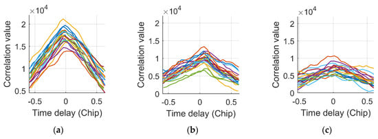 Real-world MP/NLOS autocorrelation functions overlapped for 20 ms: (a) Constructive MP (Elevation angle: 33.8°); (b) Destructive MP (Elevation angle: 33.8°); (c) NLOS (Elevation angle: 24.8°).