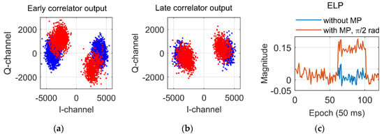 Demonstration of early late phase feature using the simulated MP signal with a fixed carrier phase difference ( rad) to the direct LOS signal: (a) Early correlator outputs. Red dots denote the simulated MP. Blue dots denote the direct LOS signal; (b) Late correlator outputs; (c) Early late phase values. ELP: early late phase