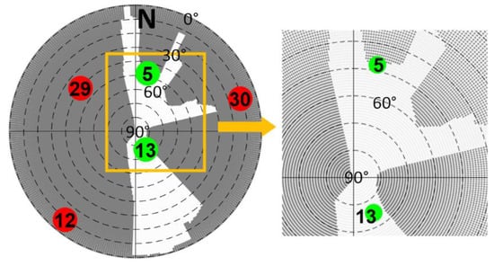 Skymask is defined as the Skyplot with building boundary information, as shown in Figure 5. The gray area denotes the building blockage. If the elevation angle of satellite is lower than that of the building boundary at the same azimuth angle, it is labelled as NLOS, e.g., PRN 29 in red. Otherwise, it is labelled as LOS in green, e.g., PRN 13 in green.