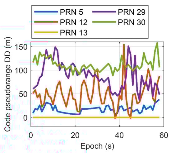 Code pseudorange double difference observable for satellites in Figure 5.