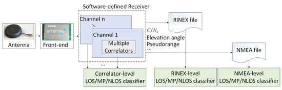 Figure 9 shows the experimental setup. The NSL Stereo front-end with an active antenna, Allystar AGR6303, was used to collect the raw GPS IF data for postprocessing. An open-sourced GPS L1 SDR that is able to output pseudorange measurements was used in this paper [38], which was modified with the implementation of multiple correlators. The multicorrelator outputs were used for correlator-level LOS/MP/NLOS classification. The SDR outputs such as pseudorange, Doppler, C/N0, etc., were converted to generate the SDR RINEX and NMEA files, which were then used in the RINEX- and NMEA-level classifiers. Details of the configuration of the experimental setup are listed in Table 4.