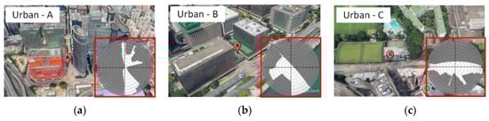 Data collection locations: (a) Dataset A; (b) Dataset B; (c) Dataset C. Skymask in the red frame indicates the sky visibility, where the gray area represents the sky blocked by surrounding buildings.