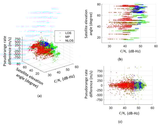 Figure 11 shows the point cloud of labelled data, from which several conclusions can be drawn for the experimental data. Firstly, in general, signal with low is likely to be NLOS, while high- signal can be either LOS or MP. MP can also have low depending on both the satellite elevation and phase difference between the direct and reflected paths. This also poses a challenge to the MP identification. Secondly, satellites with very high elevation can be NLOS in deep urban areas. Thirdly, MP and NLOS signals produce larger pseudorange rate consistency, due to the Doppler frequency difference between the direct and reflected signal.
