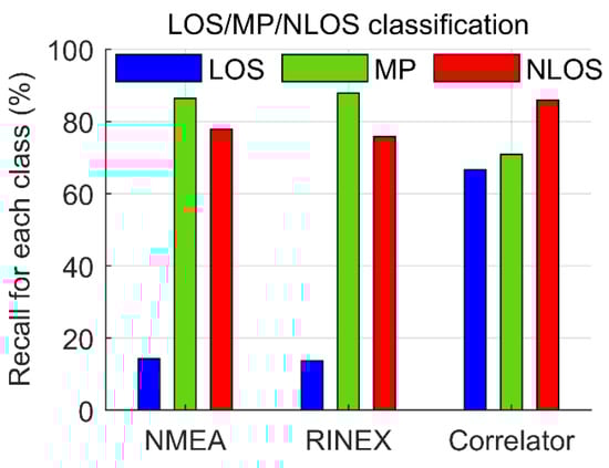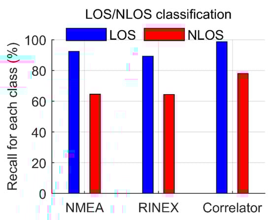 In some applications, such as the standard shadow-matching-based positioning [5], it is enough to distinguish between LOS and NLOS, i.e., the satellite visibility. As such, a comparison of LOS/NLOS classification using the three different level classifiers was also conducted. To do this, MP was put into the LOS group because the MP contains the direct signal. The LOS/NLOS classification results are shown in Table 8. The recall value for each class is shown in Figure 13. As can be seen, the LOS accuracy was significantly improved for all three kinds of classifiers. As expected, the correlator-level classifier still outperformed the other two kinds of classifiers. In specific, the F1 score of correlator-level classifier was more than 90%, and its LOS and NLOS recall values were up to 98.69% and 77.96%, respectively.