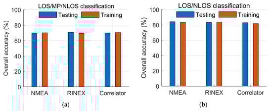 Comparison of the training and testing accuracy. All datasets were mixed to form a whole dataset, from which half was randomly selected as the training data, while the remaining half as the testing data: (a) LOS/MP/NLOS classification accuracy; (b) LOS/NLOS classification accuracy.