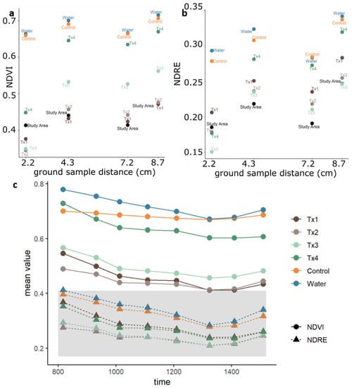 The relationship between flying height (and GSD) and time of day on detectability of leaf water status NDVI and NDRE values is plotted in Figure 2. Spectral indices vary with spatial resolution for several reasons, including the fact that lighting changes throughout the day, as well as leaf moisture. While it is possible to separate treatments and control at all resolutions (i.e., 2.2–8.7 cm GSD), the best separation between all treatments, including the water and control was at 2.2 cm and 4.3 cm GSD flown at altitude 30 m and 60 m, for both NDVI and NDRE (Figure 2a,b). At slightly coarser resolutions (7.2 cm and 8.7 cm GSD) the difference between control and water was less pronounced. NDVI and NDRE values by time of day are shown in Figure 2c. The best separation between treatments was found in the morning imagery for NDVI (between 10:00 and 12:00), and in the early morning for NDRE (between 8:00 and 10:00). The drier plots (e.g., Tx1 and Tx2) were less separable as the day progressed within both indices. The NDVI for Tx4 declined throughout the day, as we would expect, given this treatment had been enacted one day prior to the flights represented.