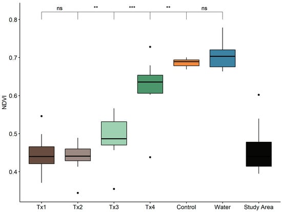The distribution of NDVI and NDRE for all resampled flights (n = 12, 8.7 cm) by treatment and in the overall study area is shown in Figure 4 and Figure S2 and Figure S3. Statistically significant differences were found in the NDVI values between Tx2 and Tx3, between Tx3 and Tx4, and between Tx4 and the control. Nonsignificant differences were found between Tx1 and Tx2, as well as the control and the water treatment (see Figure S2 for NDRE).