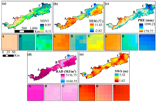 Distribution of the Global Inventory Modeling and Mapping Studies (GIMMS NDVI3g) product (a) and China Meteorological Forcing Dataset (CMFD) climate data samples (temperature (TEM), precipitation (PRE), total downward solar radiation (RAD), and near-surface wind speed (SWS)) (b–e). The magnified figures below each index represent the three corresponding random regions, named A, B, and C from the west to the east.