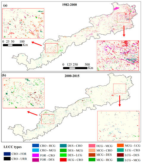 Land use and land cover (LUCC) types conversion between (a) 1982 and 2000 and (b) 2000 and 2015. CCR is croplands, FRO is forests, URB is urban construction lands, DES is deserts, HCG is high-coverage grasslands, MCG is medium-coverage grasslands, and LCG is low-coverage grasslands.