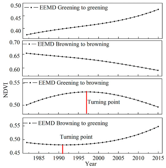 According to the Rn trend of each NDVI series, the EEMD trends in the NDVI could be classified into five classes. When the NDVI showed a significant monotonic upward or downward trend (P < 0.05), the trend was considered to be monotonic greening or browning. When the trend contained one extreme point and at least one year passed the significance test (P < 0.05), the NDVI trend was classified into greening to browning or browning to greening classes. However, if there was no significant change in the NDVI variation trend, it was classified as no significant change. Four pixels were randomly selected from the NDVI dataset of the APENC as samples of the NDVI variation trend, and they are shown in Figure 5.
