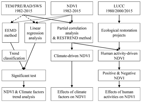 In this research, since large-scale revegetation activities were implemented in this area around 2000, the whole research period was divided into two sections to explore the impacts of anthropogenic activities on vegetation variation from 1982 to 2000 and from 2000 to 2015 (on a pixel scale). Therefore, during 1982–2000, the t0 and tn referred to 1982 and 2000, while during 2000–2015, the t0 and tn referred to 2000 and 2015, respectively. Then, the contribution rates of anthropogenic activities and land use were further superimposed to calculate the contributions of different land use changes to the NDVI. The whole workflow is shown in Figure 6.