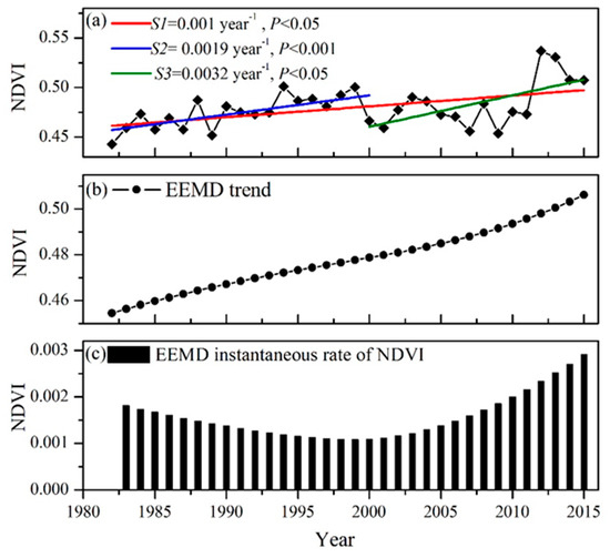 Annual NDVI trend during 1982–2015: (a) the S1, S2, and S3 mean linear trends of the mean NDVI during 1982–2015, 1982–2000, and 2000–2015, respectively; (b) the EEMD trend; and (c) the interannual instantaneous rate of EEMD.
