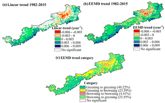 Figure 8a presents the spatial patterns of the NDVI variation trend in the APENC from 1982 to 2015. The linear trend showed that approximately 49.03% of the areas displayed a significant increase in the NDVI (slope = 0.003 year−1, P < 0.05), and these areas were primarily located in the southwest and (partially) northeast of the study region, especially in the Shaanxi, Ningxia, and Gansu provinces. However, nearly 9.48% of the region had a significant vegetation browning tendency (slope = −0.002 year−1, P < 0.05), which was mainly concentrated in the northeastern APENC. The remaining areas (accounting for 41.49% of the total region), distributed throughout the northcentral part of the APENC, showed no remarkable changes. Over the entire time series, approximately 96.24% of the regional NDVI that showed significant trends was detected through EEMD (Figure 8b), including 74.60% of the area experiencing greening (slope = 0.003 year−1, P < 0.05) and 21.64% of the area experiencing browning (slope = 0.001 year−1, P < 0.05). The spatial distribution of the EEMD trend was generally unanimous with a linear trend, except for the northcentral part of the research region, where the magnitude of the vegetation change rate was relatively low (approximately ±0.002).