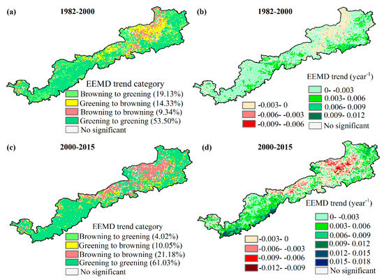 Spatial distribution of the EEMD trend classification (a,c) and variation rate (b,d) before and after 2000. Only pixels with P < 0.05 are presented.