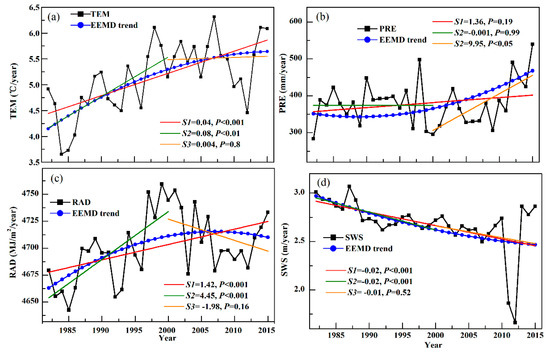 The temporal and spatial linear and EEMD trends in climatic factors are shown in Figure 10 and Figure 11. TEM, PRE, and RAD increased by 0.05 °C/year (P < 0.05), 3.54 mm/year (P < 0.05), and 1.43 MJ/m2/year (P < 0.05), respectively, during 1982–2015. Both TEM and RAD increased rapidly during 1982–2000, while after 2000, TEM was maintained at a high level and RAD declined slightly. PRE generated larger interannual fluctuations, with mean annual precipitation changes between 283.67 and 539.60 mm. The EEMD trend showed that PRE fluctuated during the entire study period, with variations that first decreased and then increased between 1982 and 2000, and a continuously increasing pattern was observed after 2000. Compared to the general upward trend in the other three meteorological factors, SWS maintained a monotonic decline during 1982–2015. Spatially, the variation trend in these climatic factors revealed an obvious spatial heterogeneity. TEM, RAD, and PRE varied with a mostly obvious zonal distribution in space. A higher warming trend occurred in the southwest, and apparent decreasing precipitation was discovered in the northcentral part of the study region. Over the whole period, SWS decreased by −0.02 m/year (P < 0.05), and a dramatic decrease was detected in the northcentral and northeastern parts of the APENC.