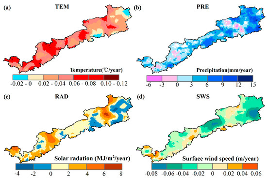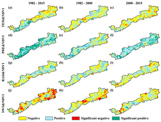 We investigated the effects of climate factors (TEM, PRE, RAD, and SWS) on NDVI variations over the entire period, and the spatial distributions of the partial correlation between the vegetation and climatic factors are shown in Figure 12. Throughout the study period, over 47.79% of the area showed that PRE had a positive effect (P < 0.05) on vegetation greening, and the mean partial correlation coefficient was more than 0.46. These areas were largely located in nonforest and nondesert areas. The positive correlation for these areas suggested that PRE was a major influential factor limiting vegetation growth. In addition, the SWS was the second most important climatic factor affecting vegetation: approximately 23.43% of the study area showed a negative correlation, mainly distributed in the northeast part of the study region. The impacts of TEM on vegetation displayed distinct north–south differences, with significant positive correlations occurring in the southwestern part (9.14%), which is dominated by cultivated farmland. A negative correlation was mainly concentrated in the northeastern part (4.01%), where grassland is the main land use type. Compared to PRE, SWS, and TEM, the effect of RAD on NDVI was quite small, with only 5.63% and 2.05% of the total area showing positive and negative correlations, respectively.