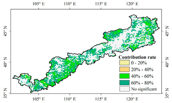 To distinguish and quantify the anthropogenic effects on the NDVI, we proposed a quantitative approach as an extension of Liu’s method [49]. Based on the above testing and calculations, the grids with 95% significance values were used in the following processing. The contribution of anthropogenic factors was calculated by Equation (11):
