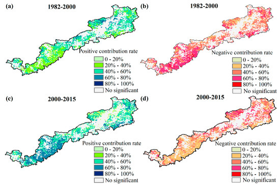 Spatial distribution of the positive (a,c) and negative (b,d) contribution rate to NDVI dynamics of human activities before and after 2000. Only pixels with P < 0.05 are presented.