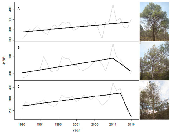 Among all the available vegetation indexes, NBR has been used frequently to monitor defoliation [21]. In this study, temporal trends of the Landsat series of the NBR index showed differences in values according to the phytoplasma defoliation levels, with different diagnostic disturbance trajectories. Initially, the NBR index showed a progressive long-duration increase in all stands, corresponding to relatively slow growth and non-severe disturbance processes until 2013. Then, the observed differences in the Landsat time series, manifested as short-duration NBR trajectories (variable combinations of both long and short duration), reflect the defoliation and mortality effects of the three types of phytoplasma damage. Indeed, we observed—between 2013 and 2017—a sharp decrease in the NBR values for the medium and high levels of defoliation and mortality, coincident with the period of highest mortality in these forests (SEDA-Network data unpublished). Phytoplasma induces very rapid crown changes and its pixel-scale impacts, expressed as the NBR index, dropped because of changes in chlorophyll content and defoliation in the stands over two or three years. We suggest that the short-term and sharp changes in the tendency of the NBR index to decline are a diagnostic spectral trajectory for phytoplasma in such P. halepensis forests, where part of the canopy is defoliated, resulting in relatively slight re-greening or death. This agrees with some studies that described the effect of defoliators on the spectral response patterns in other pine species [46]. Meigs et al. [7] analyzed the defoliation of pine forests in the US Pacific Northwest Region, using different vegetation indexes, and they observed that the trend of the NBR magnitude distinguished insect disturbance, since it was sensitive to the increasing predominance of conditions that led to defoliation. The average values of NBR of symptomatic stands can be related to symptoms severity and interannual changes. In contrast, a continuous increase in the NBR value was observed in asymptomatic stands, therefore, NBR can be used to discriminate the “healthy” and the “affected” forests.