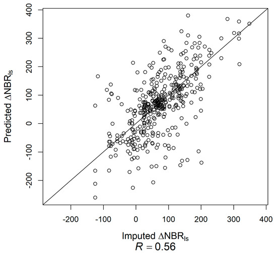 Prior to development and implementation of the k-NN algorithm, the following steps were taken to prepare the proposed environmental variables for analysis. First, a variance inflation factor (VIF) analysis was carried out among the predictor variables to determine the presence of multicollinearity [36]. Variables with a VIF >10 were removed from the posterior analysis. The collinearity analysis was performed in R 3.5.1 [37] using the R package usdm [38]. Second, we selected the most-important variables that were not highly correlated for the imputation modeling, using the varSelection function from yaImpute [39]. This function computes the generalized root mean square distance (GRMSD) as variables are added to a k-NN imputation algorithm. By adding variables, the varSelection function keeps variables that strengthen the imputation and excludes variables that weaken the imputation the most [39]. Finally, we performed the k-NN imputation (k = 3) to characterize the relationship between the environmental predictor (selected environmental variables) and the response (∆NBRls) variables. We used random forest (RF) [40].