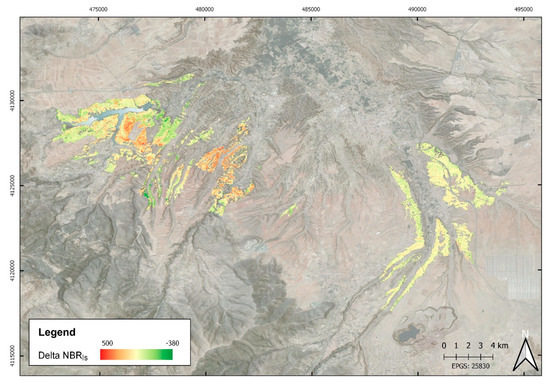 Normalized burn ratio index trajectories of the last segment (∆NBRls) values in the study area over the 30-year time period ranging from severe to non-affected defoliation across Pinus halepensis forests in the study area (Sierra de Baza, southeastern Spain).