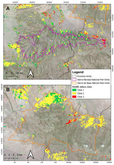 Defoliation status in Pinus halepensis stands affected by ‘Candidatus Phytoplasma pini’ in Andalusia (south-eastern Spain) grouped in three classes according to predicted ∆NBRls. (A) Sierra Nevada National Park and (B) Sierra de Baza Natural Park. Class 1: Low-risk, Class 2: Middle risk and Class 3: High-risk areas.