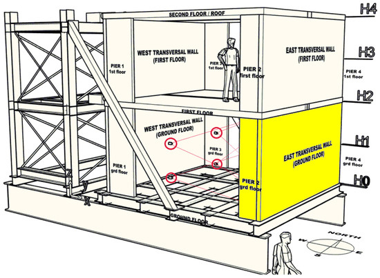 Schematic representation of the photogrammetric set-up used to monitor the out-of-plane deformations of the east transversal wall on ground floor (part highlighted in yellow). Red circles indicate the four Basler cameras used to obtain the three-dimensional (3D) photogrammetric network. The cameras were fixed on an isolated and stable steel frame inside the house, ensuring that the photogrammetric network remained stable during the experimental test. The positive loading direction went from west to east.