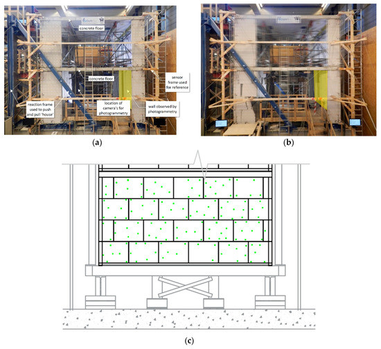 Front view from the south of the masonry structure in the test set-up for the quasi-static cyclic test: (a) detailed view of the south part; (b) impression of the deformation of the structure under horizontal load obtained by showing the extreme displacement in the east and west directions in one image. The extreme east–west displacement of the top concrete floor of the house was approximately 100 mm.