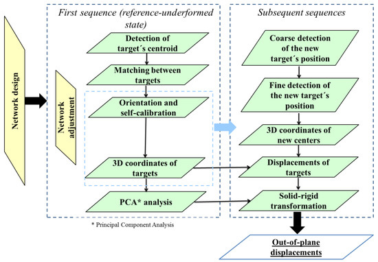By assuming that the external orientation of each camera remains stable during the experiment, the bundle adjustment obtained during the reference stage was used to estimate the 3D coordinates of each tracked target along the subsequent stages (Figure 3). For this purpose, the following approach was implemented in each set of captured frames: