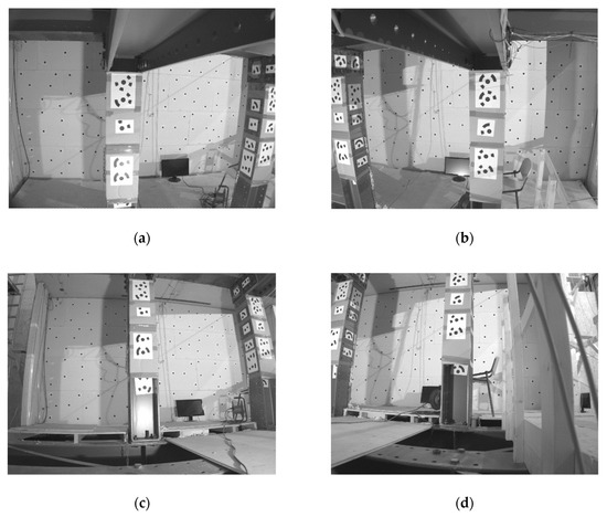 In order to characterize the out-of-plane behavior of the masonry building throughout the quasi-static test, four Basler ace acA2500–14 gm scientific cameras (Basler, Ahrensburg, Germany) equipped with a 4-mm wide-angle prime lens (Basler, Ahrensburg, Germany) were used to perfectly trigger still images. Their technical specifications are illustrated in Table 1. Complementary to this, and with the aim of guarantying the stability of the photogrammetric system during the test, all the cameras were fixed to an isolated steel structure, placed inside the structure, comprising a normal imaging geometry as shown in Figure 1.