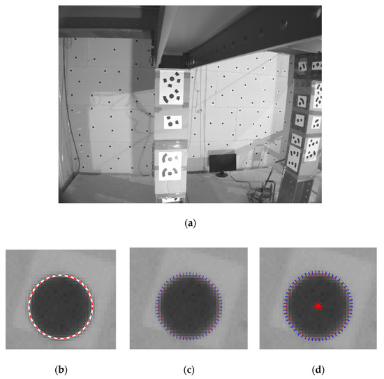 Specifically, the Hough transformation for circle detection was implemented using as inliers all circles with a radius between 7 and 13 pixels (Figure 7b). To detect the center of the monitored circular targets, the non-linear least squares procedure reported in Section 2.2.3 was applied (Figure 7). During this phase, an average residual was obtained from the circular fitting process of 0.09 pixels (0.15 mm), highlighting the robustness of the process. Within this dataset, a minimum value of 0.05 pixels was obtained in the points placed at the center of the wall, and a maximum value of 0.28 pixels was obtained in the points detected at the edges of the walls. This difference of residuals could be assigned to the geometrical distortion of the lens, which was especially apparent at the edges (Figure 6).