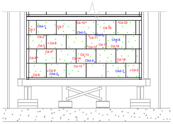 The design of the photogrammetric network was established with a set of 138 circular targets distributed all over the masonry wall (Figure 5), and four perfectly triggered still-image cameras located at 3.10 m on the wall (ground sample distance, GSD, of 1.71 mm) in a fixed and stable position, providing a normal imaging geometry (Figure 1, Figure 5 and Figure 6). The photographic acquisition was controlled by a central personal computer (PC) for triggering the four cameras synchronously and storing the images. This resulted in a total of 9896 images with a mean overlap of 61% and a minimum number of three intersecting rays for improving accuracy and reliability. The mean baseline between adjacent images was about 2.21 m, implying a base/depth (B/D) ratio of 0.70. To avoid errors coming from the rolling shutter, the images were acquired under the global reset release shutter mode. Furthermore, velocities of the captured moving object were relatively slow (7 μm/s) compared to the exposure time (order of magnitude of tens of μs). Images were captured with 30-s intervals during several hours of testing.