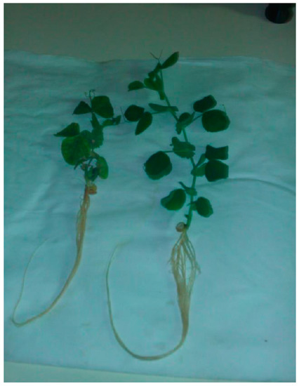 The growth rate of seedlings (the length of roots and the stalk), fresh and dry weights of leaves, and the roots of four randomly selected plants from each of the investigated variants were measured (Figure 2). The dry weight was determined after drying plant material at 85 °C for 24 h until a constant weight was obtained.